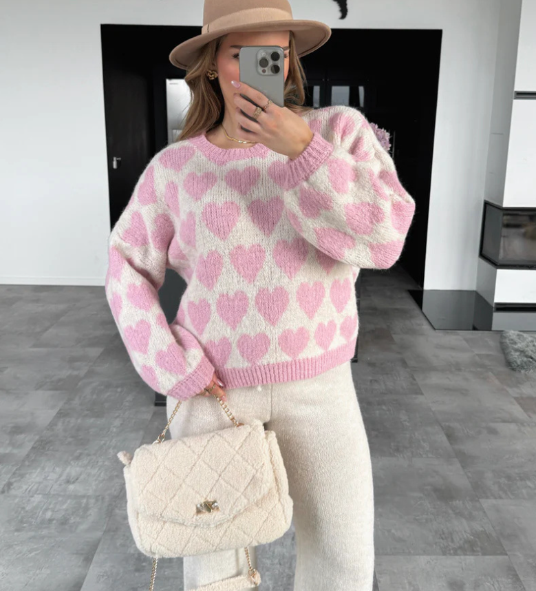 Valentine's Day pink heart jacquard short knitted sweater